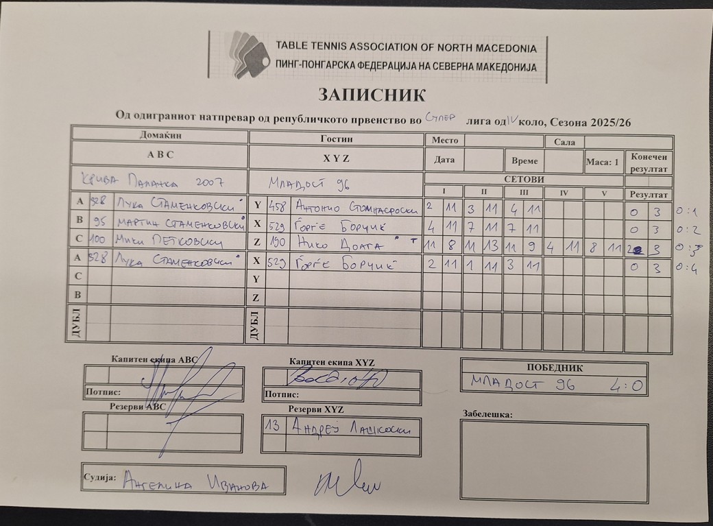 | Младост 96 | - | 10 60 АС Ѓорче Петров | 4 | : | 0 | 10 60 АС Ѓорче Петров | - | Младост 96 | : | ||||