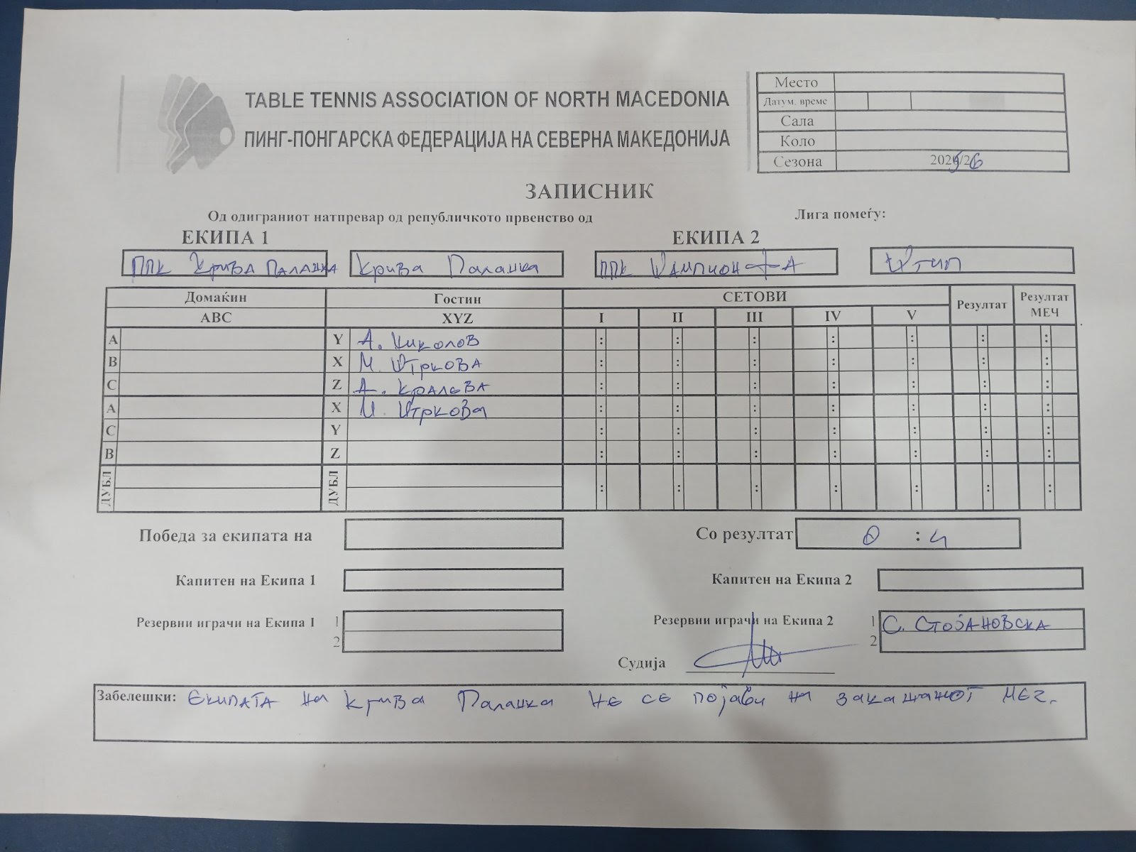 Крива Паланка – Шампиони ФА 0 : 4*службено