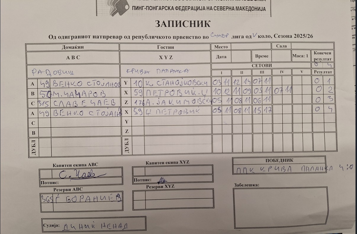| Крива Паланка | - | Телеком Нец 2 | 4 | : | 3 | Телеком Нец 2 | - | Крива Паланка | : | ||||